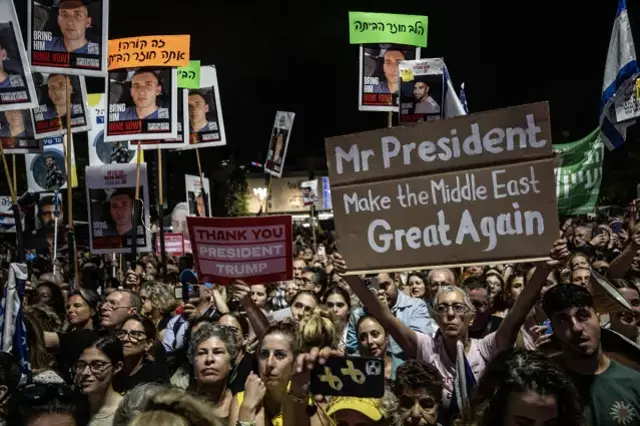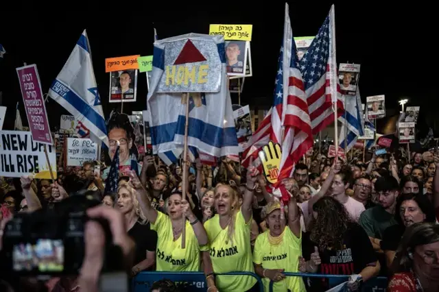 Witkoff, İsrail Başbakanı Netanyahu’dan bahsettiğinde ise meydandaki İsrailliler yuhaladı. Netanyahu’nun adı her geçtiğinde tepki gösteren kalabalık, Netanyahu karşı protestolarda sıkça kullanılan ‘utan, utan, utan’ şeklinde İbranice slogan attı. Witkoff, kalabalığın tepkisinin sürmesi üzerine “Siz nasıl düşünürsünüz bilemem.” diyerek, Netanyahu’nun sürece katkı sunduğunu öne sürdü.