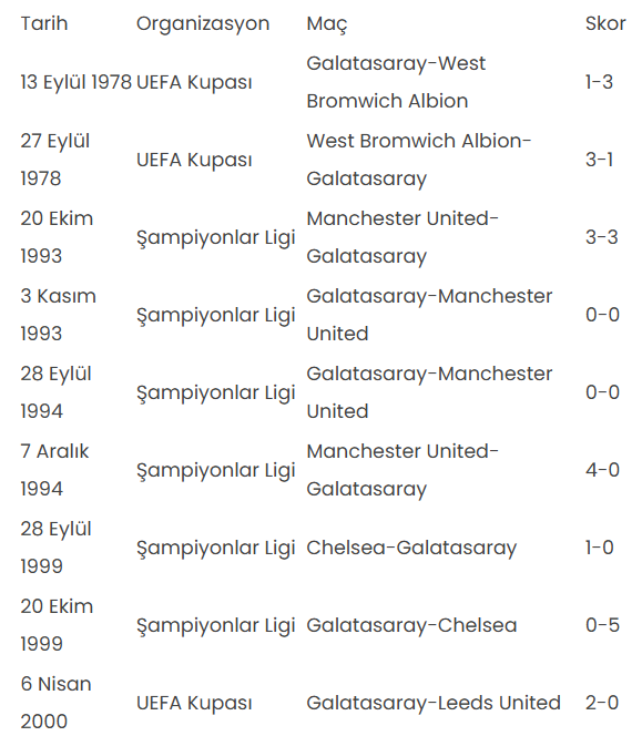 Galatasaray, İngiliz rakiplerinden Liverpool ve Chelsea ile dörder, Arsenal ile 3, West Bromwich Albion ve Leeds United ile ikişer kez karşılaştı.