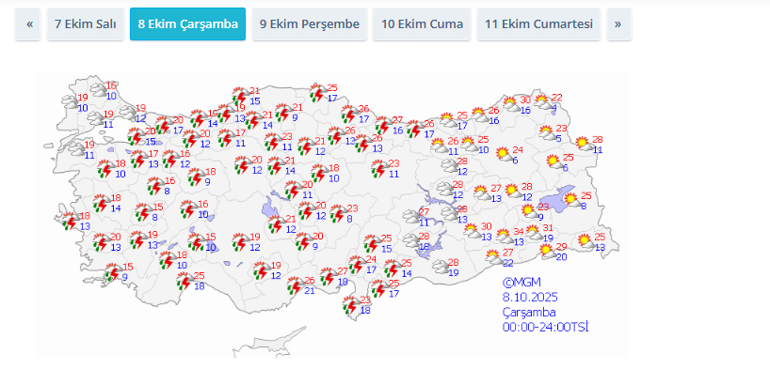 Meteoroloji Genel Müdürlüğü tarafından yapılan tahminlere göre: kuzey, iç ve batı kesimlerinin parçalı ve çok bulutlu, Marmara, Ege, Batı Akdeniz, İç Anadolu’nun batısı, Batı Karadeniz (Sinop hariç) ile Mersin, Osmaniye çevreleri, Adana’nın güney ve doğusu, Kahramanmaraş ve Hatay’ın batısı, Kırşehir ve Aksaray çevrelerinin sağanak ve gök gürültülü sağanak yağışlı, diğer yerlerin az bulutlu ve açık geçeceği tahmin ediliyor.