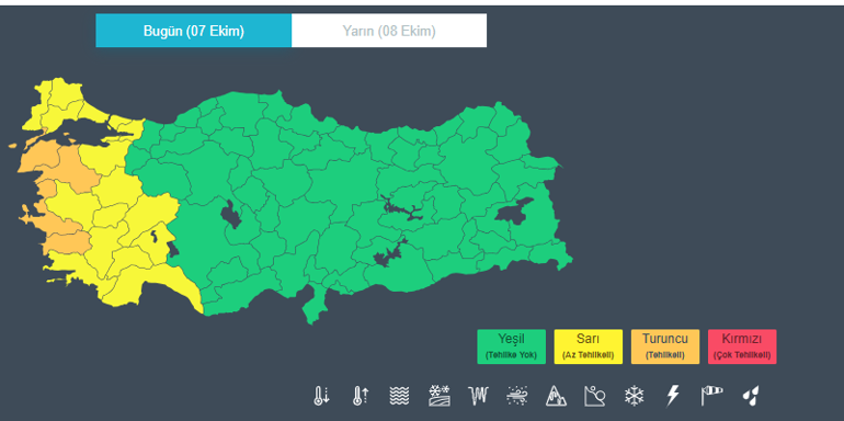Çanakkale, Balıkesir, İzmir ve Aydın için turuncu kodlu uyarı verildi. İstanbul, Yalova, Kırklareli, Tekirdağ, Edirne, Kocaeli, Bursa, Kütahya, Manisa, Uşak, Afyonkarahisar, Denizli, Burdur, Muğla, Isparta ve Antalya için ise sarı kodlu uyarı verildi.